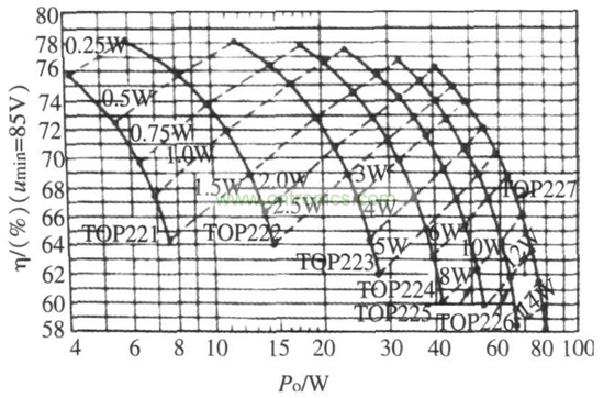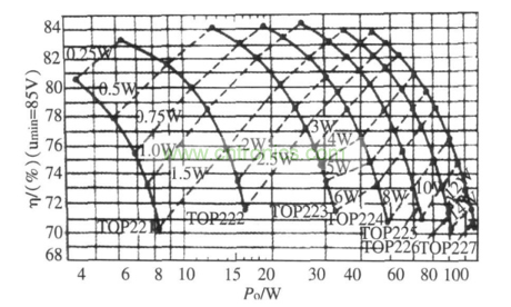 在設(shè)計(jì)開關(guān)電源時(shí),首先就要面臨如何選擇合適的開關(guān)電源控制芯片。在選擇芯片的時(shí)候,要既能滿足要求,又不因?yàn)檫x型造成資源的浪費(fèi)。下面就介紹利用TopswitchⅡ系列開關(guān)電源的功率損耗( PD ) 與電源效率(η),輸出功率( Po ) 關(guān)系曲線,快速選擇芯片的型號(hào),從而完成寬范圍輸入的通用開關(guān)電源的設(shè)計(jì)。