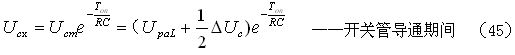 如果考慮電阻R對(duì)電容器C充電時(shí)的分流作用,以及開(kāi)關(guān)管由導(dǎo)通到完全關(guān)斷期間漏極電流(逐步減小)對(duì)電容器C充電時(shí)的分流作用,則(33)和(34)式可以改寫(xiě)為: