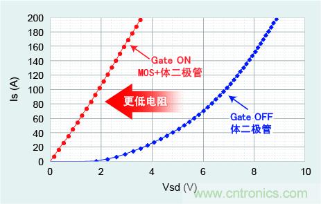 一般Si-IGBT元件無法逆向導通,而SiC-MOSFET可通過體二極管實現(xiàn)常時逆向導通。另外,通過輸入柵極信號,還可實現(xiàn)MOSFET的逆向導通,與二極管相比,可實現(xiàn)更低電阻。通過這些逆向導通特性,與二極管整流方式相比,可在1000V以上的范圍采用高效同步整流方式的技術。
