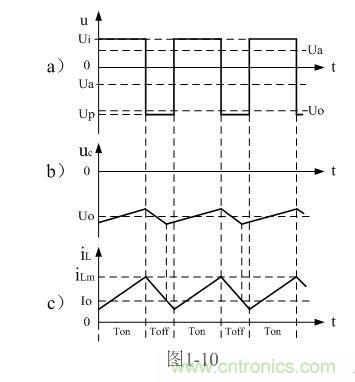 順便指出,反轉(zhuǎn)式串聯(lián)開關(guān)電源輸出電壓為負(fù)脈沖,當(dāng)圖1-7中的濾波電容器C開路時,負(fù)脈沖的幅度將非常高,負(fù)脈沖是一個幅度按指數(shù)規(guī)律下降的尖脈沖,其幅度主要由負(fù)載電阻的大小,以及占空比來決定;當(dāng)圖7中的濾波電容器C接入后,反轉(zhuǎn)式串聯(lián)開關(guān)電源輸出電壓uo為一負(fù)方波,此方波我們可稱之為半波平均值,關(guān)于半波平均值的概念我們后面還會詳細(xì)解釋。