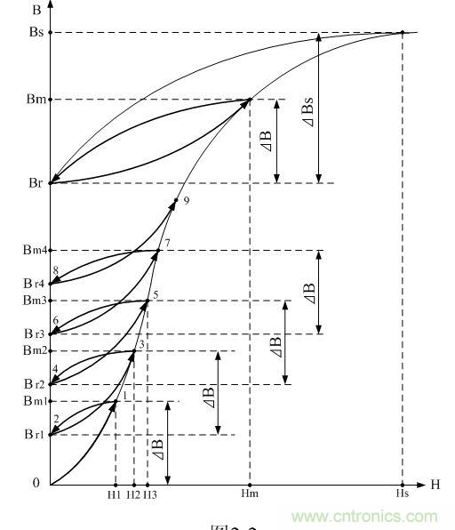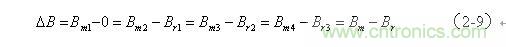 同理,當(dāng)?shù)诙€直流脈沖加到變壓器初級線圈a、b兩端時,變壓器鐵芯中的磁感應(yīng)強度B將按圖2-2中新的磁化曲線2-3上升,磁感應(yīng)強度被磁場強度磁化到第二個最大值Bm2,使磁感應(yīng)強度產(chǎn)生一個增量ΔB,  。