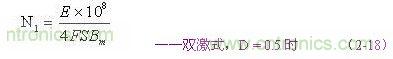 (2-17)和(2-18)式,為計算雙激式開關變壓器初級線圈N1繞組匝數的公式。式中,N1為變壓器初級線圈N1繞組的最少匝數,S為變壓器鐵芯的導磁面積(單位:平方厘米),Bm為變壓器鐵芯的最大磁感應強度(單位:高斯),τ為脈沖寬度,或電源開關管的導通時間(單位:秒),E為脈沖電壓的幅度,單位為伏,F為開關電源的工作頻率,單位赫芝。