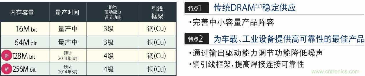 另外,DRAM的主流產品逐漸向大容量、高速化的DDR2/DDR3-SDRAM發(fā)展,中小容量SDRAM的供應越來越不穩(wěn)定。LAPIS Semiconductor將中小容量的SDRAM定位為傳統DRAM注1,作為唯一可長期供貨的日本國內制造商,不僅面向車載用途市場,而且面向更廣闊的工業(yè)設備市場,正在不斷完善產品的產品陣容。