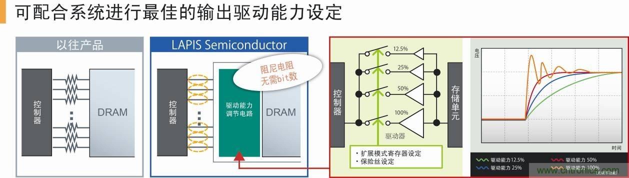 本功能有助于實現適合用戶系統的電流驅動能力優(yōu)化、降低輻射噪聲、減少輻射噪聲對策零部件數量。另外,可按出貨時固定規(guī)格的驅動能力設定供貨,即使使用已有的SDRAM控制器無需配置擴展模式寄存器,即可使用最佳的輸出驅動能力設定的產品。
