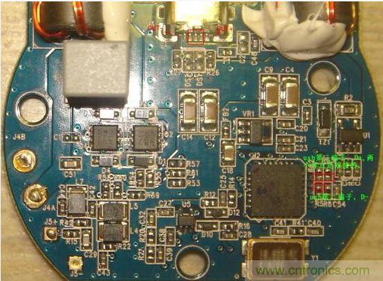 重點來了,點金石底部有三顆螺絲,撕掉那層膠墊就能看到。拆掉螺絲后,用硬物從插充電線的那個四方口可以很輕松的把底蓋撬開。然后是電路板,在micro接口那端是用膠水將電路板粘在下面的金屬塊上的,還是老辦法,用吹風機吹熱,然后小心翹下來。要注意的是,翹電路板的時候注意別弄斷角落上兩根頭發(fā)絲那么細的線圈。其實為保險起見,還如不先用烙鐵把這兩根線焊下來再拆電路板。電路板拆開可以看到一塊金屬,上面若干螺絲,拆吧。拆出金屬塊,你會發(fā)現(xiàn)金屬塊的背面粘了一塊形狀挺藝術的磁塊,用刀片切斷膠就可以弄下來了。