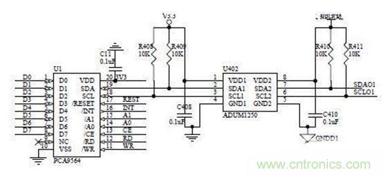 OZ89采樣模塊將采集處理后的數(shù)據(jù)通過(guò)I2C總線發(fā)送到LF2407,由于LF2407自身不帶I2C 接口,本設(shè)計(jì)利用PCA9564擴(kuò)展其I2C接口。為了防止電磁干擾影響I2C總線上數(shù)據(jù)的傳輸,必須對(duì)總線信號(hào)進(jìn)行隔離,考慮到I2C 總線是雙向傳輸?shù)?,使用ADuM1250雙向隔離芯片進(jìn)行隔離。PCA9564及雙向隔離電路如圖2所示。