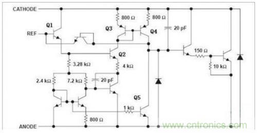 通過TL431 的內(nèi)部電路,可以看出,Cathode 的電壓不應(yīng)該低于2.5V。因?yàn)橹挥蠧athode 的電壓高于2.5V,Q1 的這個(gè)三極管,才可以工作在放大狀態(tài)。如果低于2.5V,那么Q1 會(huì)進(jìn)入飽和方式,而失去放大作用。不難看出,此時(shí),Q2、Q3、Q4 等三極管也會(huì)失去放大作用而飽和。
