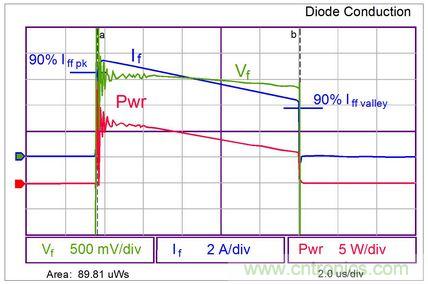 導(dǎo)電損耗的量測(cè)方式類似。它們應(yīng)當(dāng)起于導(dǎo)通損耗終點(diǎn),終于關(guān)閉損耗起點(diǎn)。這可能難于精確量測(cè),因?yàn)閷?dǎo)電損耗的時(shí)間刻度遠(yuǎn)大于