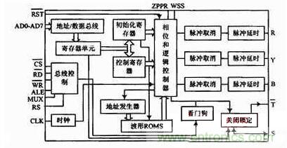 SA4828原理框圖如圖3所示。它接收并存儲微處理器初始化命令和控制命令,主要由總線控制、地址/數(shù)據(jù)總線、存儲器、控制寄存器組成,以控制字的形式實現(xiàn)。三相輸出控制電路的每相輸出控制電路由脈沖取消和脈沖延時電路構(gòu)成,脈沖取消將脈沖寬度小于取消時間的脈沖去掉,延時電路保證死區(qū)間隔,以防止在轉(zhuǎn)換瞬間橋路開關(guān)器件出現(xiàn)直通現(xiàn)象。