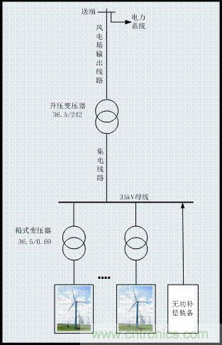 4)風(fēng)電場送出線路:升壓變壓器將風(fēng)電電力升壓后經(jīng)送電線路接入電力系統(tǒng)。