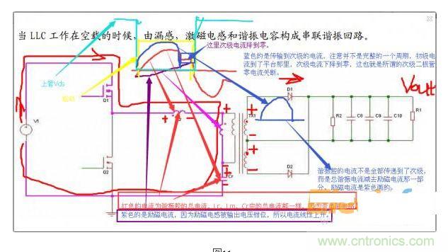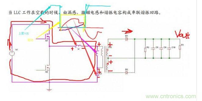 注意不同顏色畫(huà)的驅(qū)動(dòng)、Vds、電流波形。諧振腔電流紅色的是諧振腔總電流,紫色的是勵(lì)磁電流,因?yàn)榇渭?jí)二極管導(dǎo)通,Lm端電壓被鉗位到n*(Vout-Vf),所以勵(lì)磁電流是線性上升的。