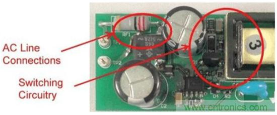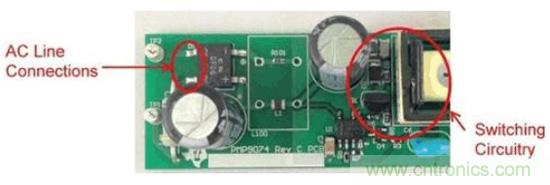 注意,漏極連接與輸入引線之間有一些由輸入電容器提供的屏蔽。該電容器的外殼連接至主接地,可為共模電流提供返回主接地的路徑。如圖2所示,這個(gè)微小的電容會(huì)導(dǎo)致電源EMI簽名超出規(guī)范要求。