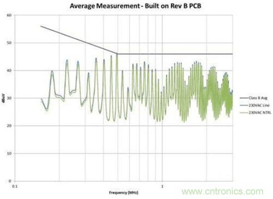 圖4是修改后的效果圖。我們?cè)诠收宵c(diǎn)位置為EMI規(guī)范獲得了大約6dB的裕量。此外,我們還顯著減少了總體EMI簽名。所有這些改善都僅僅是因?yàn)椴季值恼{(diào)整,并未改變電路。如果您的電路具有高電壓開(kāi)關(guān)并使用了屏蔽距離,您需要非常小心地對(duì)其進(jìn)行控制。