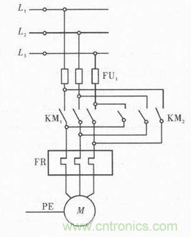 在眾多的操作系統(tǒng)中均要求電動機能夠?qū)崿F(xiàn)正反轉(zhuǎn)給操作,從電動機的工做原理中可知,需將三相電源中的任意兩個進行對調(diào),就能實現(xiàn)電動機的反向運轉(zhuǎn),因此電動機實現(xiàn)正反轉(zhuǎn)的實質(zhì)便是電源進線的調(diào)換。但若僅調(diào)換進線,容易導(dǎo)致電源短路,因此必須設(shè)置互鎖,圖2是三相異步電動機正反轉(zhuǎn)的原理設(shè)計圖,圖中KM1和KM2均是交流接觸器主觸頭,當KM1吸合時,KM2交流接觸器主觸頭就會斷開,然后便可實現(xiàn)電機的正轉(zhuǎn)。若是斷開交流接觸器主觸頭KM1,KM2就會吸合,此時電動機則會實現(xiàn)反轉(zhuǎn),圖中的FU1主要用于防止電源短路,圓形代表電機M。