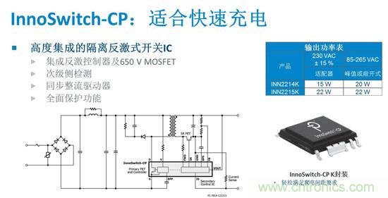 “目前PI提供兩種型號(hào)的InnoSwitch-CP器件。INN2214K IC提供15W輸出功率,適用于通用輸入電壓范圍的充電器和適配器應(yīng)用,而更大型號(hào)的INN2215K在同類(lèi)應(yīng)用中可提供最大22 W的輸出功率。” Jason介紹說(shuō)。