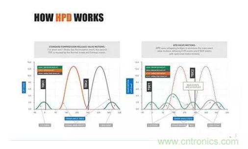 雖然發(fā)動(dòng)機(jī)制動(dòng)設(shè)計(jì)效果顯著,但是增加的車輛總重、車輛較低的滾動(dòng)阻力和低排量發(fā)動(dòng)機(jī)都要求更強(qiáng)的輔助制動(dòng)功率,Jacobs的解決方案是高功率密度HPD 發(fā)動(dòng)機(jī)制動(dòng)系統(tǒng)。在高功率密度發(fā)動(dòng)機(jī)制系統(tǒng)中,橋接器、控制閥和液壓執(zhí)行機(jī)構(gòu)都與常規(guī)裝置系統(tǒng),共同應(yīng)用到進(jìn)氣凸輪。驅(qū)動(dòng)階段發(fā)動(dòng)機(jī)保持四沖程模式,制動(dòng) 階段發(fā)動(dòng)機(jī)切換到兩沖程模式,從而制動(dòng)沖程的數(shù)量加倍。Jacobs解決方案能夠更高效地利用渦輪增壓器,控制其最優(yōu)化制動(dòng)充壓效果。