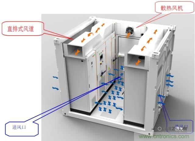 陽光電源箱式逆變房將逆變器、直流柜、通訊單元集成于一體,采用簡潔的分段直排式風道,風道內(nèi)不含風機,零損耗,免維護。風道長度僅1m,壓力損失小,風機處于最佳效率狀態(tài)。逆變器在工作時,大部分熱量通過風道排出集裝箱外,僅有少量熱量通過輻射傳到箱體內(nèi)部,內(nèi)部空氣吸收熱量后向頂部流動,再由集裝箱頂部排風扇排出,確保了逆變器的長期可靠運行。