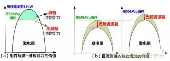 如正面案例所述,當(dāng)輻照度或溫度等環(huán)境條件變化時,組件輸出功率會超過規(guī)格書中標(biāo)定的最大功率,即“組件超發(fā)”,此種情況通常發(fā)生在部分光照資源較好的部分Ⅰ類資源區(qū),這就要求逆變器需具備將組件能量全部轉(zhuǎn)化的能力,即對逆變器“吐”的能力要求較高。否則將會出現(xiàn)棄光的現(xiàn)象,降低發(fā)電量,影響用戶收益,如圖2(a)所示。
