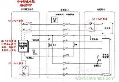 2)在充電過(guò)程中,非車(chē)載充電機(jī)控制裝置通過(guò)對(duì)檢測(cè)點(diǎn)1的電壓進(jìn)行檢測(cè),如果判斷車(chē)輛接口由完全連接變?yōu)閿嚅_(kāi)(如車(chē)輛意外移動(dòng)、充電槍線纜被意外擾動(dòng)等),則控制非車(chē)載充電機(jī)停止充電,應(yīng)在100ms內(nèi)斷開(kāi)K1、K2、K3、K4。