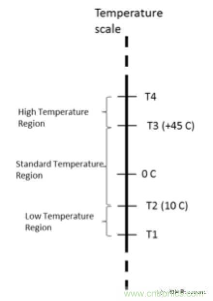 如圖1所示,JEITA規(guī)范定義了最低溫度(T1)、最高溫度(T4)和位于二者之間的三個溫度區(qū)(低、中、高),以確保充電安全。