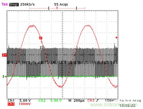直列式電流感應(yīng)方法看似是最合理的,因?yàn)檫@是最終要測(cè)量的電流。但這種方法存在一個(gè)問(wèn)題。驅(qū)動(dòng)MOSFET或IGBT的PWM信號(hào)對(duì)電流感應(yīng)放大器造成嚴(yán)重破壞。感測(cè)電阻處的共模信號(hào)從電源電壓被驅(qū)動(dòng)到接地,具有非常快速的瞬態(tài)開關(guān)特性,而電流感應(yīng)放大器試圖測(cè)量感測(cè)電阻本身的小差分信號(hào)。圖2是由PWM逆變器產(chǎn)生的正弦相電流(紅色波形)的示波器截圖。這種情況下,PWM頻率為100兆赫(MHz),由LMG5200 GaN半橋功率級(jí)提供(更多詳細(xì)信息,請(qǐng)參見(jiàn)底部的TI設(shè)計(jì))。需要注意的是,快速開關(guān)信號(hào)是直列式電流感應(yīng)放大器測(cè)量相電流時(shí)所接收的信號(hào)。這就像在有颶風(fēng)的情況下,當(dāng)杯子在海上漂浮,而試圖測(cè)量杯中液體一樣。難怪大多數(shù)設(shè)計(jì)師會(huì)考慮使用低側(cè)感應(yīng)!下面我們將介紹另外一種方法。