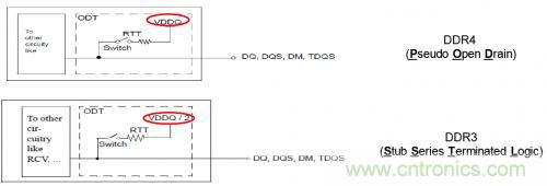 驅(qū)動(dòng)DRAM工業(yè)發(fā)展的一個(gè)主要市場(chǎng)需求是對(duì)內(nèi)存器件的低功耗要求。介于這個(gè)原因,DDR4引入了一個(gè)新的IO驅(qū)動(dòng)標(biāo)準(zhǔn),成為PSOD(Pseudo Open Drain)。在PSOD里,接收端將信號(hào)端接到軌電壓(VDD),而不是軌電壓的一半(VDD/2)。