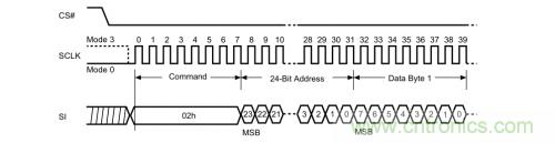其實(shí),無(wú)論是對(duì)芯片的擦除,編程還是讀取操作,我們大致可以按照以下的套路來(lái):寫命令---寫地址---寫(讀)數(shù)據(jù)。正如以下的時(shí)序圖一樣清晰明了,我們先把片選信號(hào)拉低,再發(fā)個(gè)0x02頁(yè)編程命令,再發(fā)個(gè)地址,就可以輕松寫數(shù)據(jù)了。