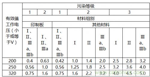 爬電距離是兩個(gè)導(dǎo)電體沿絕緣材料表面的最短距離,而最小爬電距離只由表格2N來確定;具體查表方法如下:
