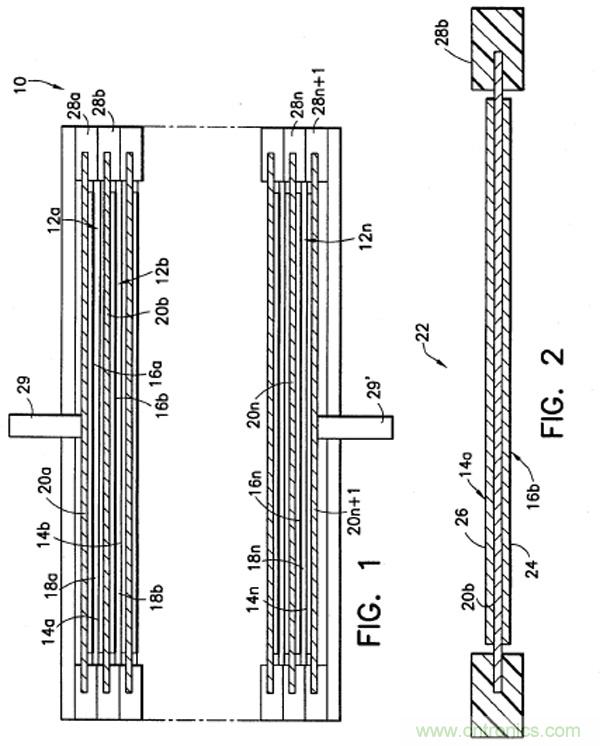 雙極性電極的研究早在二、三十年以前就已經(jīng)出現(xiàn)。例如在20實際九十年代,美國雅迪尼(Yardney)技術公司就對雙極鋰離子電池展開了研究。雙極性電池設計可以將單元電池cell-stack中相鄰cell之間的電阻最小化,使得每個雙極性cell種的正負極活性涂層表面上的電流和電勢達到更加均勻的分布,因此,采用雙極性cell構成的電池具有更高的功率特性。下圖Fig1是一個典型的由多個雙極性電池單元構成的雙極性鋰離子電池截面圖,F(xiàn)ig2是提取出來的其中一個雙極性電池單元。其中,12a、12b,…,12n是電池單元;14a、14b,…,14n是電池單元的正極側;16a、16b,…,16n是電池單元的負極側;18a、18b,…,18n隔膜;20b、20c,…,20n是集流體(例如,F(xiàn)ig2中的14a和16b共用一個集流體),集流體可采用雙金屬基材,例如,Cu-Al雙金屬,負極活性物質涂敷在Cu側,正極活性物質涂敷在Al側;24是負極活性物質,26是正極活性物質;28a、28b,…,28n是絕緣性連接固定結構,每個雙極性電極通過該連接結構固定起來。在Fig1和Fig2中,一共有n-1個雙極性電極(集流體兩側分別有正極、負極活性物質),最上層20a只有負極一側,另一側跟負極極柱29相連,最下層20n+1只有正極一側,另一側跟正極極柱29相連。