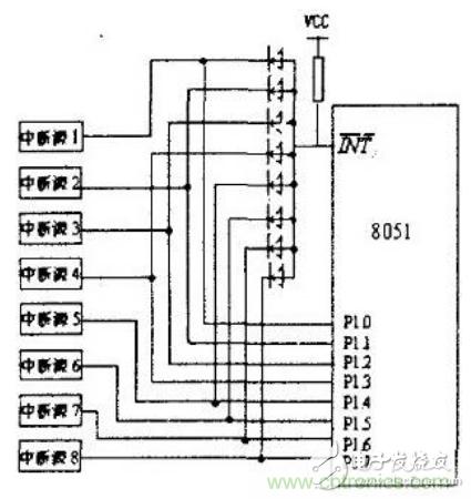 這種方法是:把各個(gè)中斷源通過硬件“或非(高有效,如CD4002)”(與,低有效)門引入到單片機(jī)外部中斷源輸入