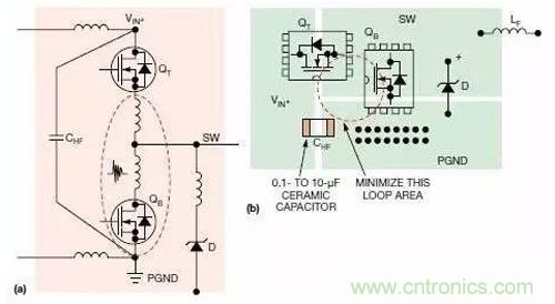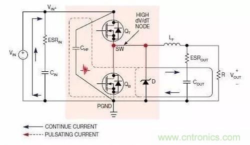 圖2給出了一個同步降壓轉換器中的連續(xù)電流路徑和脈沖電流路徑,實線表示連續(xù)電流路徑,虛線代表脈沖(開關)電流路徑。脈沖電流路徑包括連接到下列元件上的走線:輸入去耦陶瓷電容CHF;;上部控制FET QT;以及下部同步FET QB,還有選接的并聯肖特基二極管。