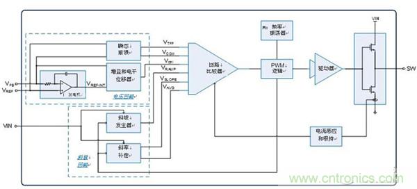 2.斜坡回路根據(jù)VIN和PWM信號(hào)生成斜坡電壓。經(jīng)優(yōu)化的斜坡補(bǔ)償值僅為下降斜率斜坡電壓的一半。