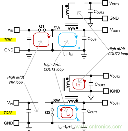 圖 2. Fly-Buck 轉(zhuǎn)換器在一次側(cè)有兩個高 di/dt 環(huán)路。所有二次環(huán)路都是高 di/dt。