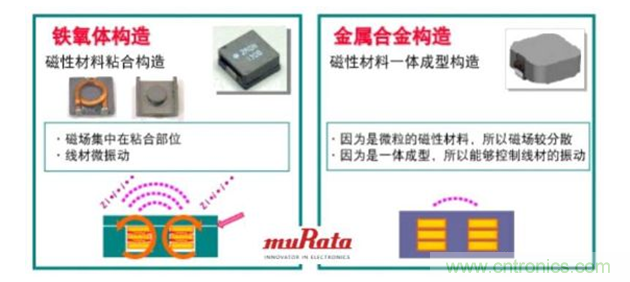 對(duì)于金屬合金構(gòu)造的電感來(lái)說(shuō),因?yàn)樾纬删€圈的磁性材料是微粒的,所以磁場(chǎng)較分散;一體成型構(gòu)造也能夠控制線材的振動(dòng),從而很難產(chǎn)生嘯叫問(wèn)題。