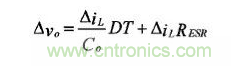 輸出濾波電容的選擇應(yīng)考慮工作頻率、輸出電流紋波、輸出電壓紋波和能量?jī)?chǔ)存能力。電解電容的等效串聯(lián)電阻(ESR)會(huì)隨開(kāi)關(guān)工作頻率的變化而變化。輸出電壓的紋波由以下公式給出: