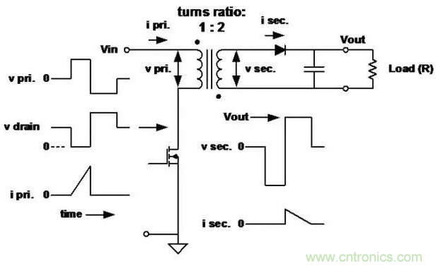 ■此處初級電感很低,用于確定峰值電流和存儲的能量。當(dāng)初級開關(guān)斷開時,能量傳送到次級。
