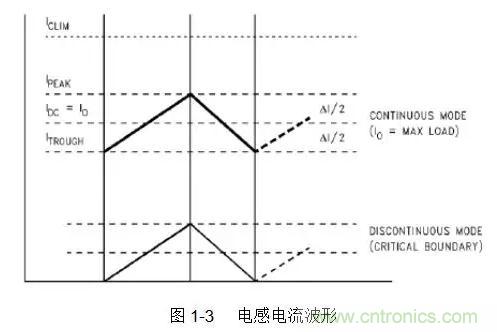 Buck/Boost型開關(guān)電源,伴隨開關(guān)管的開和關(guān),儲能電感的電流波形如圖1-3所示: