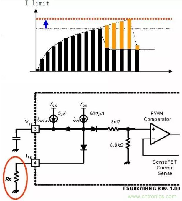 1)增大峰值電流限流點I_limit,可允許流過更大電感電流Id:將與Pin4相接的電阻增大,從內(nèi)部電流源Ifb分流更小,使作為電流限制參考電壓的PWM比較器正輸入端的電壓將上升,即允許更大的電流通過MOSFET/變壓器,可以提供更大的能量。
