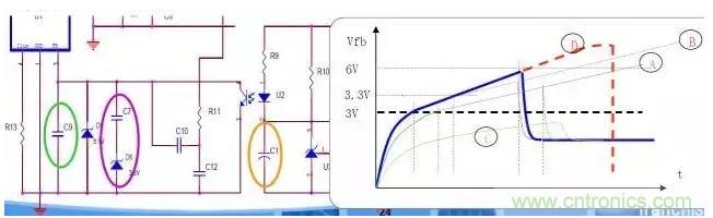 使輸出電壓達到正常值時,反饋腳電壓Vfb仍然小于保護點。使Vfb遠離保護點而緩慢上升,或延長反饋腳Vfb上升到保護點的時間,即降低Vfb的上升斜率,使輸出有足夠的時間上升到正常值。