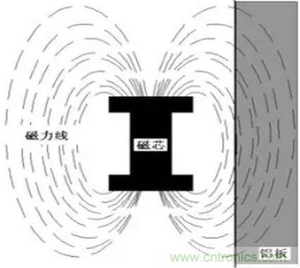 當(dāng)在一個(gè)工字電感旁邊放置鋁板時(shí)。如圖2所示,由于鋁板屬于逆磁性材料,其磁阻很大。相當(dāng)加鋁板時(shí),原先的磁通面積減小。