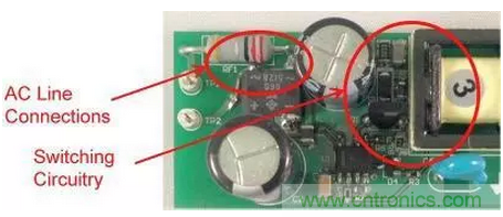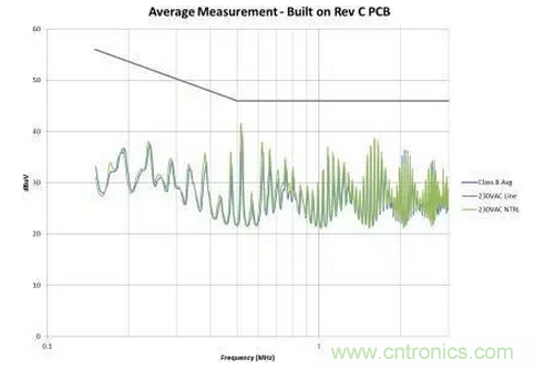 注意,漏極連接與輸入引線之間有一些由輸入電容器提供的屏蔽。該電容器的外殼連接至主接地,可為共模電流提供返回主接地的路徑。如圖2所示,這個微小的電容會導(dǎo)致電源EMI簽名超出規(guī)范要求。