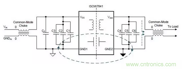 上圖是ISOW7841設(shè)計(jì),使用扼流圈來降低共模電流以及返回路徑環(huán)路面積,間接減少輻射發(fā)射。 共模扼流圈可插入輸入和輸出電源或連接到系統(tǒng)的任何長電纜上。