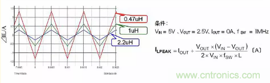 在這里,為加深對電感工作的理解,進(jìn)一步說明電感值變化時(shí)電感電流如何變化的情形。下圖表示在相同工作條件下將電感值設(shè)為0.4μH、1μH、2.2μH時(shí)ILPEAK。