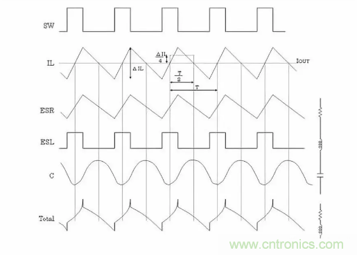通過開關(guān)所產(chǎn)生的電感電流紋波ΔIL將產(chǎn)生與ESR成單純正比的紋波電壓,有些ESL則會產(chǎn)生方形波電壓,與電容值部分合成,最下方波形成為最終的輸出紋波電壓波形。