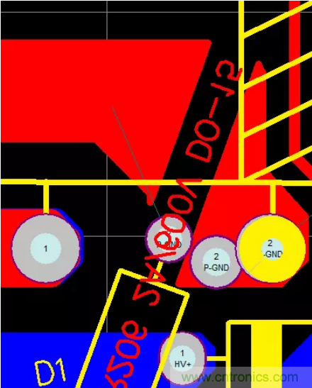 47.PCB的熱點(diǎn)區(qū)域一定要遠(yuǎn)離輸入、輸出端子,防止噪聲源串到線上導(dǎo)致EMI變差,在不得已而為之時(shí),可增加地線或其它屏蔽方式進(jìn)行隔離,如下圖增加了一條地線進(jìn)行有效隔離。