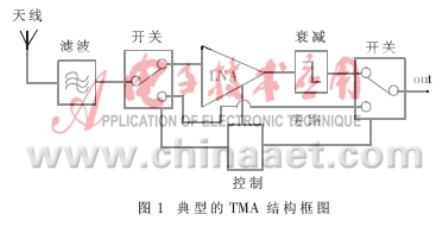 很多情況下,因為基站與移動設(shè)備不平衡連接的緣故,從基站到移動設(shè)備的信號強度和傳輸距離都要超過移動設(shè)備向基站的反向傳輸,并且由于天線與基站間的反饋損耗,使得這種不平衡性變得更大。為了改善這種不平衡性,擴大基站接收的覆蓋面,最直接的解決方案是加裝塔裝放大器TMA或Masthead放大器。而TMA中最重要的模塊LNA(如圖1所示)對接收的信號具有選頻功能,并把選頻后的信號進行低噪聲放大,使系統(tǒng)靈敏度增強,覆蓋半徑增大。