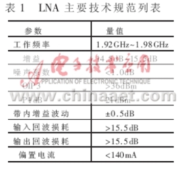 為使圖2中的LNA模塊噪聲系數(shù)。截點和增益達到表1中的各項指標,設(shè)計漏極電流Id=60mA?同時,要求單個放大元件在此偏置點的工作性能達到優(yōu)于表1的規(guī)范值。由于E-pHEMT元件ATF-54143在電流Id=60mA下,具有最佳的截點(IP3)和最小噪聲系數(shù)Fmin;漏源極電壓Vds為3V時,具有稍高的增益;偏置是+5V穩(wěn)定電壓,所需單極性+3V電壓更具有優(yōu)勢,因此選擇其作為放大元件。