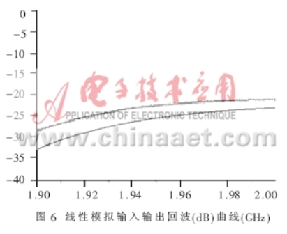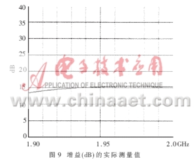 得到了完整的電路PCB板后,就要實際測量電路的各個參數(shù),驗證設(shè)計的仿真結(jié)果是否與之相符,是否最終符合表1的設(shè)計技術(shù)規(guī)范。本文所采用的測試儀器是HP8753ES網(wǎng)絡(luò)分析儀和HP8970B噪聲儀。圖8、圖9表達出放大器實測的NF和增益曲線,在帶寬為0.1GHz的頻率范圍內(nèi)NF的值在0.8dB和1.0dB之間,增益在1.97GHz達到最大值15.5dB,在1.99GHz達到了15.3dB。由于NF是在實際PCB板外腔體內(nèi)測得的,包含了同軸連接器的損耗和二級噪聲損耗,其測量指標表明實際的電路NF特性要稍差于模擬特性。圖10是輸入、輸出的回波曲線。當頻點在1.96GHz時,輸入回波為18dB,輸出回波達到22.5dB,放大器的OIP3在直流偏置Vds=3V,Id=60mA時測得值為37dBm,P1dB為21.4dBm。電路在較低的偏置狀態(tài)下Vds=3V,Id=40mA放大器的NF和增益都沒有降低,只有OIP3測出下降為36.5dBm。
