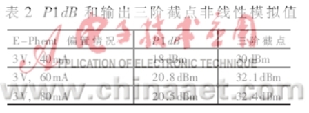 對于非線性模擬,常以諧波平衡模擬(HB)來實現(xiàn)。非線性模擬方法HB計算速度快,能夠處理分布元件和分立元件的電路,并很容易與更高階諧波及互調(diào)元件相容。ATF-54143管的P1dB和OIP3模擬非線性模型是基于W.R.Curtice模型,這個模型可以非常近似地模擬直流和小信號工作狀態(tài)(包括噪聲),對于截點的模擬則做出模擬預測結(jié)果比實際值要偏低。P1dB和OIP3的值如表2 所示:當平衡LNA放大器的OIP3模擬結(jié)果為32.1dBm時,P1dB則為20.8dBm,P1dB的模擬結(jié)果與實際的測量結(jié)果很接近,而OIP3的模擬結(jié)果則偏低,實際的測量結(jié)果達到37dBm。