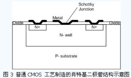 在一般的無(wú)源UHF RFID 標(biāo)簽的應(yīng)用中,出于成本的考慮,希望芯片電路適合于普通CMOS工藝的制造。而遠(yuǎn)距離讀寫(xiě)的要求對(duì)電源恢復(fù)電路的功率轉(zhuǎn)換效率提出了較高的要求。為此,很多設(shè)計(jì)者采用標(biāo)準(zhǔn)CMOS 工藝來(lái)實(shí)現(xiàn)肖特基勢(shì)壘二極管,從而可以方便地采用多級(jí)Dickson倍壓電路結(jié)構(gòu)來(lái)提高電源轉(zhuǎn)換的性能。圖3 所示是普通CMOS 工藝制造的肖特基二極管結(jié)構(gòu)示意圖。在設(shè)計(jì)中,不需要更改工藝步驟和掩膜板生成規(guī)則,只需在版圖上作一些修改,就可以制作出肖特基二極管。